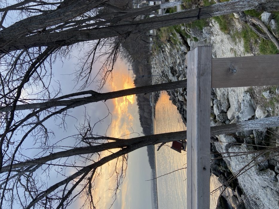 - "An outdoor scene is depicted at dusk or dawn, characterized by a prominent orange and yellow sunset illuminating the horizon and reflecting on the water, beneath a partially overcast sky" by FM-Z7t2i1, licensed under CC BY 4.0