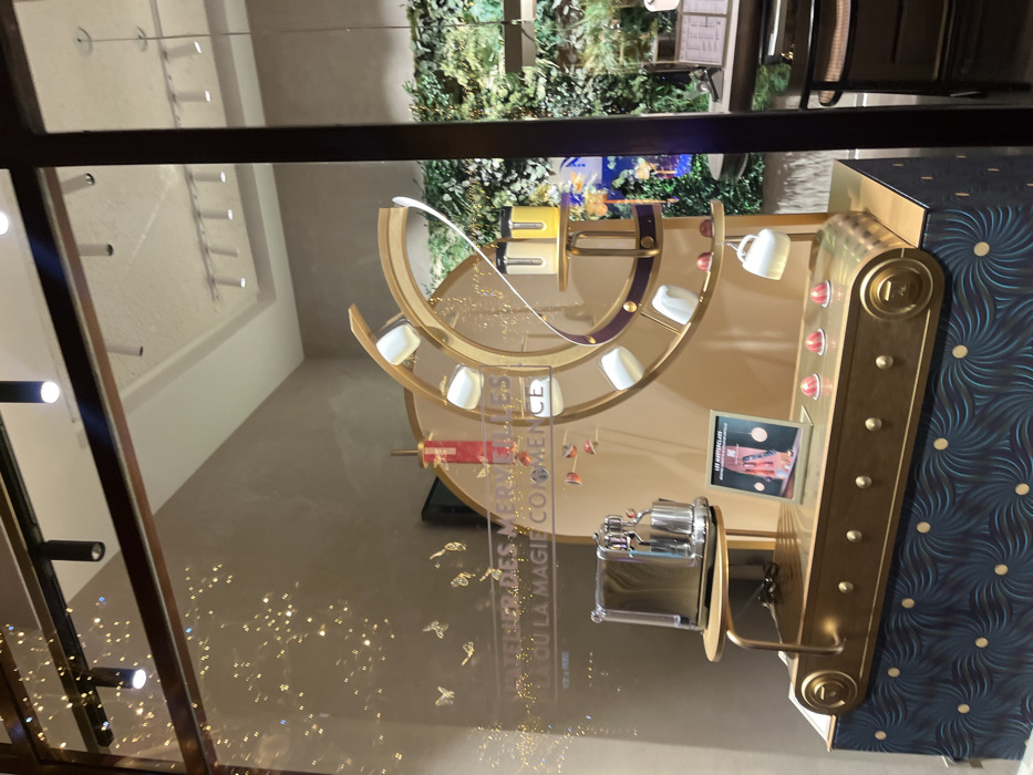 A shop window display features a golden, circular mechanical device. It has white containers and kitchen items like a toaster attached. A small, framed picture with an illustration is also present. A metal structure with red buttons sits to the right. The window is decorated with lights, reflections, and text. A green foliage background can be seen above the display.