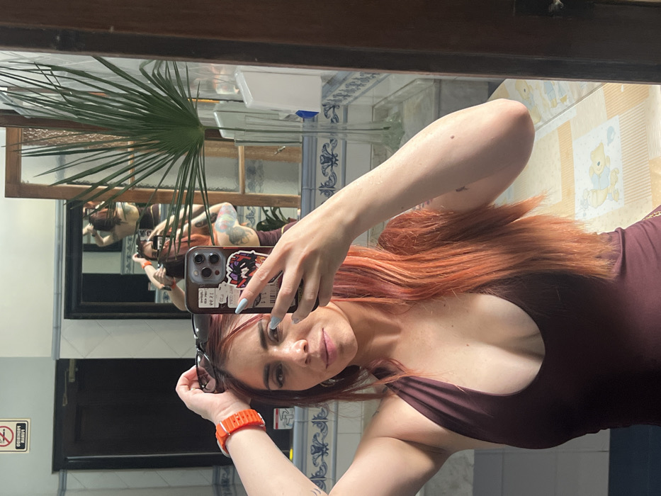 A woman with reddish-orange hair and light blue fingernails holds a phone to take a selfie in a bathroom mirror