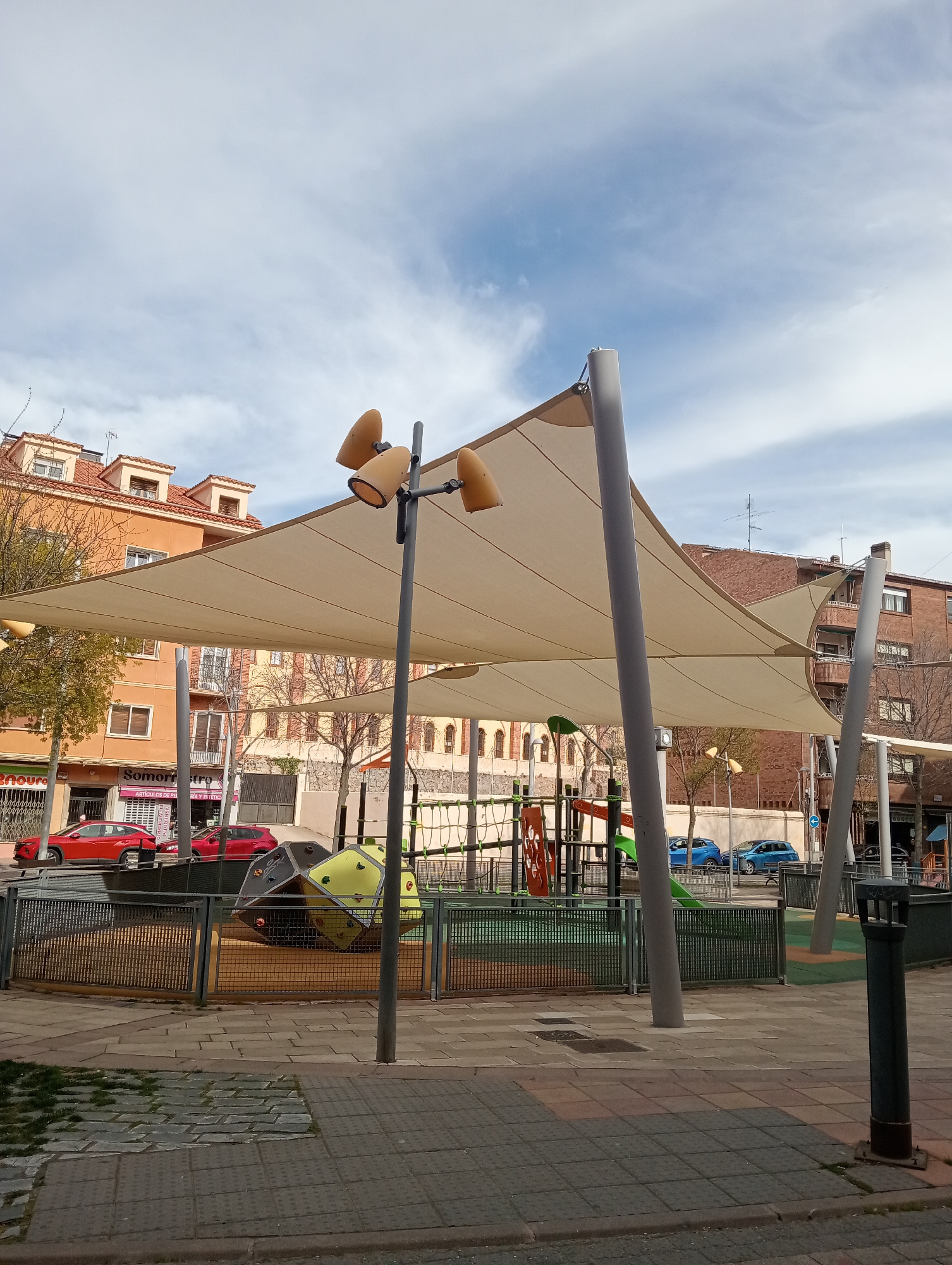 playground in Segovia, Spain. The playground is fenced and covered with a tan shade sail supported by metal poles. Within the playground, there's a climbing structure and other play equipment. Outside the fence, the ground is paved with gray stones. In the background, there are several buildings, including apartment buildings and a storefront with a sign that reads "Somorr." Red and blue cars are parked on the street. The sky is blue with scattered clouds. A streetlight with multiple tan conical shades stands near the front of the playground. A dark green trash receptacle is also visible near the edge of the playground.