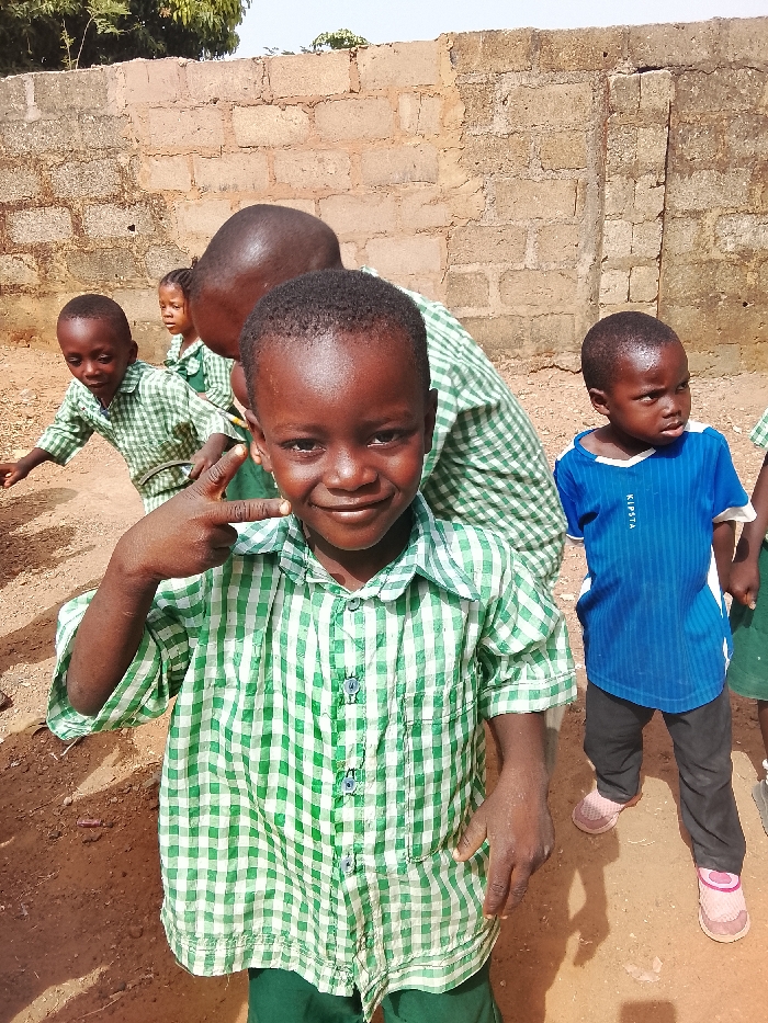 This image depicts five dark-skinned children outdoors in Akwanga, Nigeria, standing on reddish-brown dirt ground. The immediate background consists of a light brown concrete block wall. In the foreground, a young child, wearing a green and white checkered long-sleeved shirt and green trousers, smiles directly at the camera, making a V-sign gesture with their right hand at face level. To the right of this child, a second young child, dressed in a blue vertically striped short-sleeved shirt with white trim, dark trousers, and light pink shoes, looks towards the right side of the frame. Behind the central foreground child, the back of a third child's head and shoulders are visible, also wearing a green and white checkered shirt. To the left and slightly behind the central child, a fourth child in a similar green and white checkered shirt leans forward, looking downward and to the left. A fifth, smaller child is partially visible in the mid-ground, behind the third child, also wearing a green and white checkered shirt. The ground is uneven and appears to be bare earth with some small debris. The concrete block wall is unrendered and shows some discoloration. Above the wall on the left, hints of green foliage and trees are visible, under a bright, clear sky. Strong overhead sunlight creates distinct shadows on the ground.