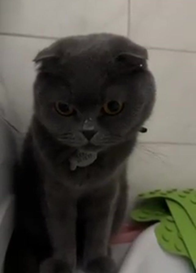 gray Scottish Fold cat sitting on a white surface in a bathroom