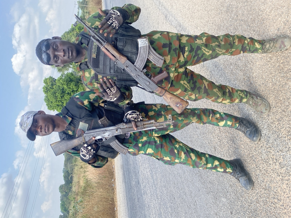 Two adult males, wearing camouflage fatigues (green, brown, black, tan pattern), black tactical vests, and tactical gloves with skull/skeleton patterns, stand on an asphalt surface. The scene is outdoors in Zaki Biyem, Nigeria, under a bright sky with scattered clouds, with dense vegetation and trees in the background. The male on the left, wearing a grey camouflage Nike baseball cap and black boots, holds an AK-pattern rifle with a metal buttstock, resting its buttstock on the ground. The male on the right, with black sunglasses pushed onto his forehead and green tactical boots, displays a 'NIGERIAN' patch on his vest. He holds an AK-pattern rifle with a wooden buttstock and two magazines horizontally across his body, while extending both hands forward with palms open and thumbs tucked.