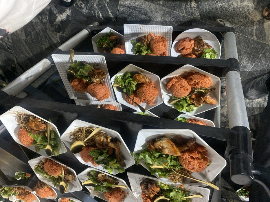 A mobile cart holds numerous white plates of food. Each plate contains a portion of reddish-brown, rounded food, along with green leafy vegetables and, on some, tan noodles or fried chicken. The plates vary in shape from square to hexagon to round. A gold-colored spoon is seen on many plates. The cart is black and silver, with a multi-tiered design. The background shows a grey speckled floor.