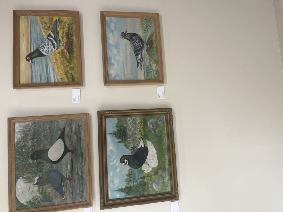 This image presents a static indoor scene within an art exhibition space, specifically located in Oklahoma City, United States; the exact address is unidentifiable from the visual data. Four framed paintings, each depicting one or more pigeons in a natural landscape, are mounted on a smooth, light cream-colored wall. The paintings are arranged in a 2x2 grid pattern. The top-left, top-right, and bottom-right paintings are enclosed in simple light brown wooden frames. The bottom-left painting is enclosed in a more ornate, gold-toned frame. Specific details of the depicted subjects in the paintings are as follows: 1. **Top-Left Painting:** Features two pigeons, one primarily grey and one black with a prominent white breast, standing on a grey stone path near a small, light-colored dish. Lush green foliage and a stone archway form the background. 2. **Top-Right Painting:** Depicts a single grey and white pigeon with a dark head, standing on a grassy, sandy bank overlooking a large body of blue water under a sky with orange and yellow hues. 3. **Bottom-Left Painting:** Shows a single black pigeon with a distinct white breast and fluffy white tail feathers, resting on green grass among rocks and sparse yellow flowers. Pine trees and a distant body of water are visible under a blue sky. 4. **Bottom-Right Painting:** Features a single grey and white pigeon standing on a verdant hill. A panoramic view of a valley with a winding river and scattered green trees extends into the background under a blue sky with white clouds. Three small, white, rectangular information plaques with black text are affixed to the wall: one positioned horizontally between the top two paintings, one vertically below the top-right painting, and one vertically to the right of the bottom-left painting. No individuals or active interactions are visible within the frame. The environment is well-lit, consistent with an indoor gallery setting.