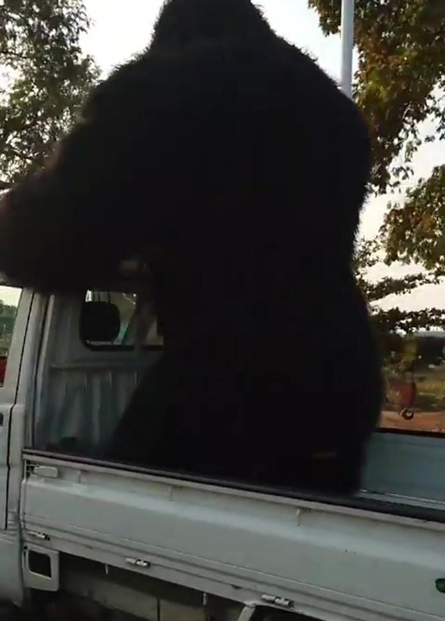 white pickup truck driving on a road. In the bed of the truck is a large, black gorilla costume. A banner is attached to the front of the truck advertising an event called "Chillaxua" on December 25, featuring various activities such as bounce castles and dancing. Two people are inside the cab of the truck. The driver is wearing a white shirt, and the passenger is wearing a red shirt. The truck is driving on a paved road in an outdoor area with trees and buildings in the background. The gorilla costume appears to be waving its arms as the truck moves.