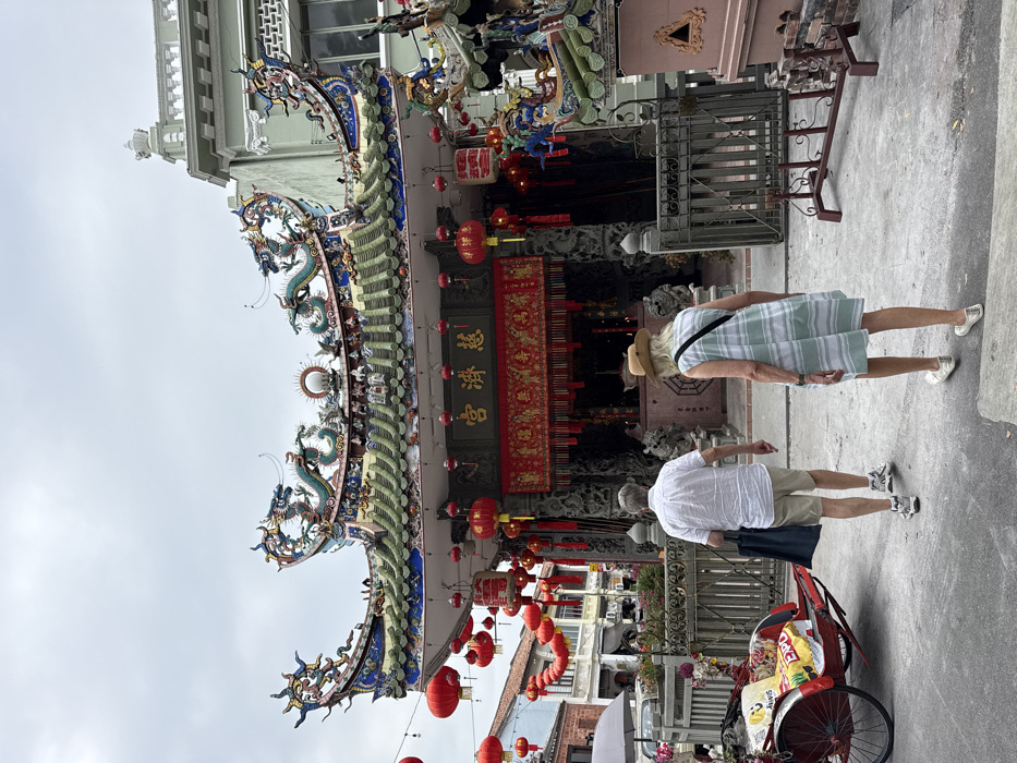 Two elderly tourists stand before a Chinese temple, its ornate roof adorned with dragons. Red lanterns hang in rows, leading the eye toward the temple's entrance. One tourist wears a striped dress and a straw hat, while the other is dressed in a white shirt and khaki shorts. A trishaw filled with shopping bags rests to the side. The scene is captured at a slight upward angle.
