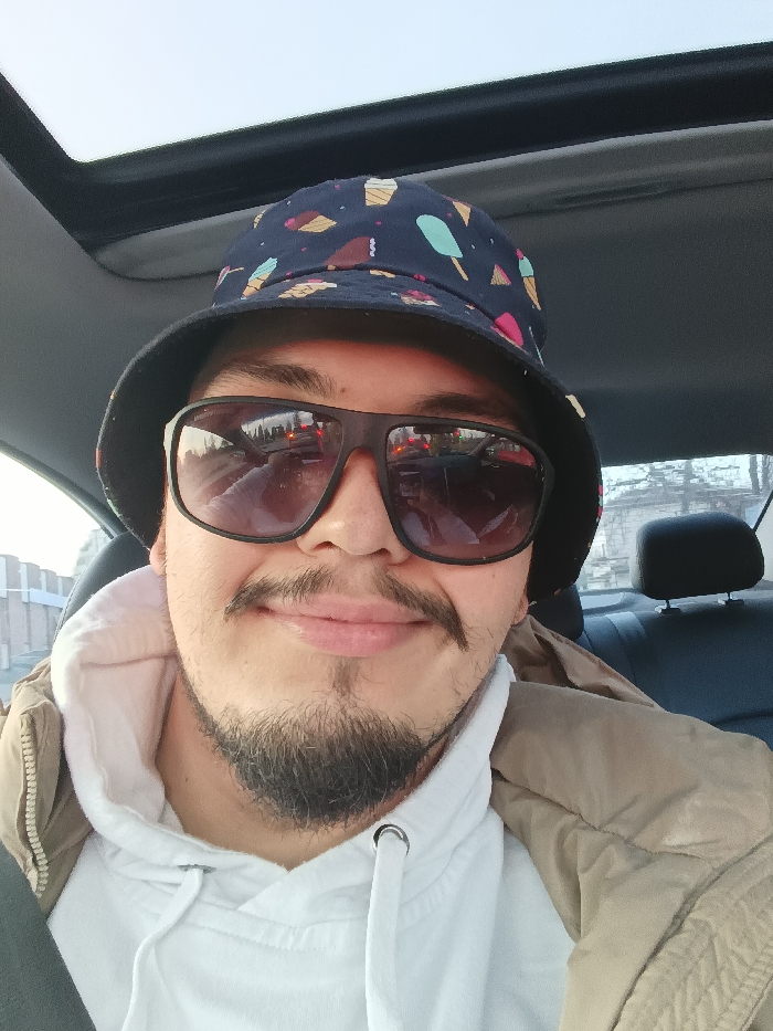 A single male individual is depicted in a close-up, chest-up self-portrait, positioned within the front passenger compartment of a vehicle. He wears a dark blue bucket hat patterned with multicolored ice cream cones and popsicles, and dark-framed sunglasses that reflect an urban street scene with traffic lights and other vehicles. His facial hair includes a mustache and a chin beard. He is dressed in a white hooded sweatshirt under a tan puffer jacket, with a seatbelt visible across his left shoulder. Above him, a car sunroof is partially open. Through the vehicle's windows, blurred urban elements are visible: a light-colored barrier or building facade to his left, and a distant building with horizontal courses to his rear right. The reflections in his sunglasses and the background elements indicate an urban environment with active traffic, consistent with a city setting like Sofia, Bulgaria. A precise street or landmark within Sofia cannot be definitively identified from the visual data.