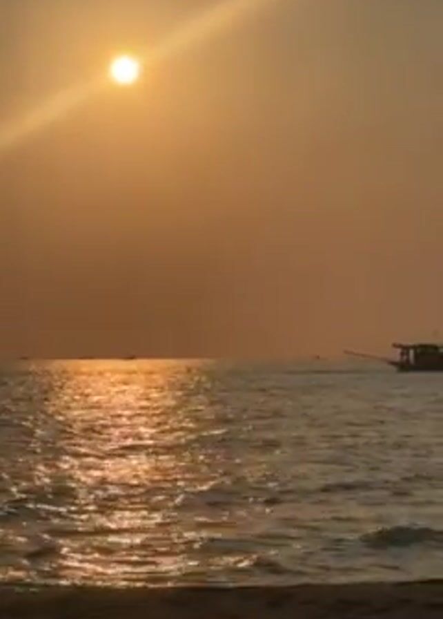 beach at sunset. The sun is bright orange in the sky, with a long ray shining downwards. The ocean is shimmering with orange light reflecting off the waves. A boat is floating in the distance. The beach is visible in the foreground. There is indistinct speech in the video.