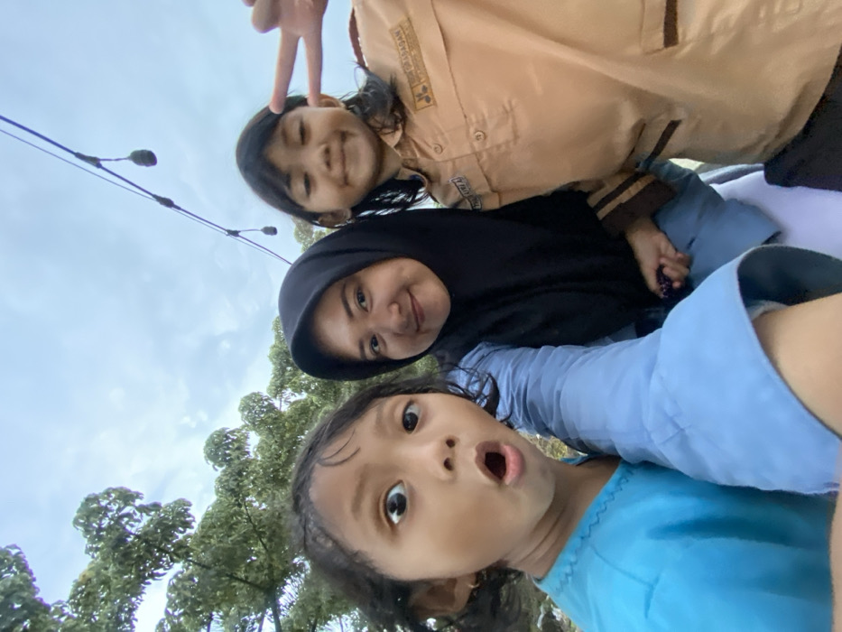 A selfie-style photograph depicts three individuals outdoors in the city of Kalitengah, Indonesia, under an overcast sky. On the left, a young girl with dark hair and a bright blue short-sleeved top exhibits a wide-eyed expression with her mouth open. In the center, an adult female wearing a black hijab and a light blue long-sleeved top smiles faintly towards the camera. Her right hand is visible near her waist, holding a small, dark, irregularly shaped object. To the right, another young girl, dressed in a tan short-sleeved uniform shirt with dark stripes on the sleeves and a patch on the left chest, smiles subtly while holding up two fingers in a peace sign with her right hand. Dense green tree foliage is visible in the background, primarily on the left and center, while a string of dark, spherical outdoor lights stretches across the upper right portion of the cloudy sky.