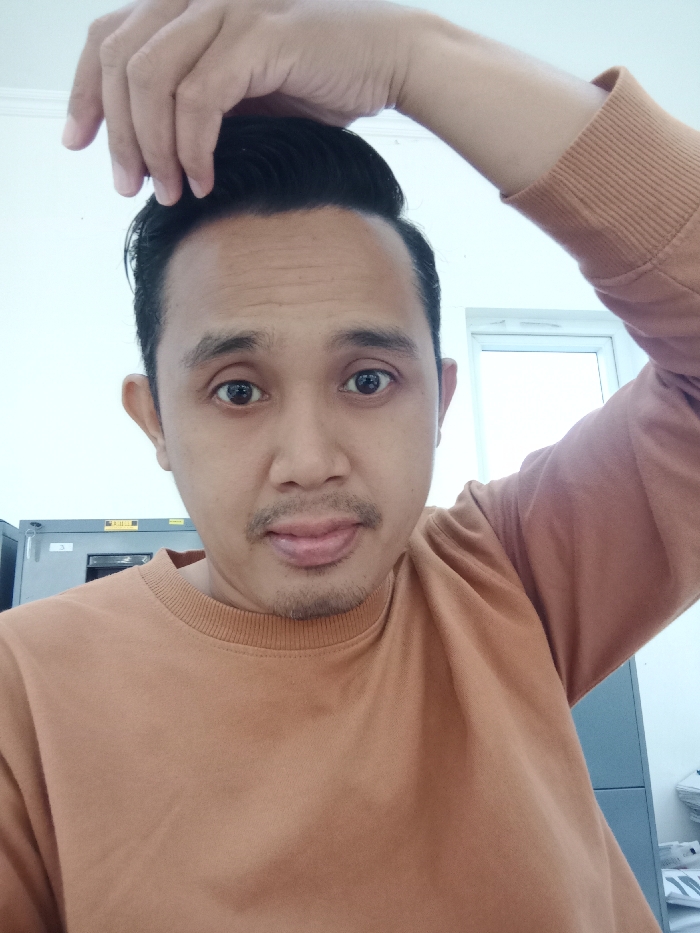 A man in a brown sweater looks directly at the camera. His dark hair is styled upward, and his hand is on his head. He has brown eyes, a mustache, and slightly parted lips. The background includes a white wall, a window with natural light, and a metal cabinet. The lighting is bright and even.