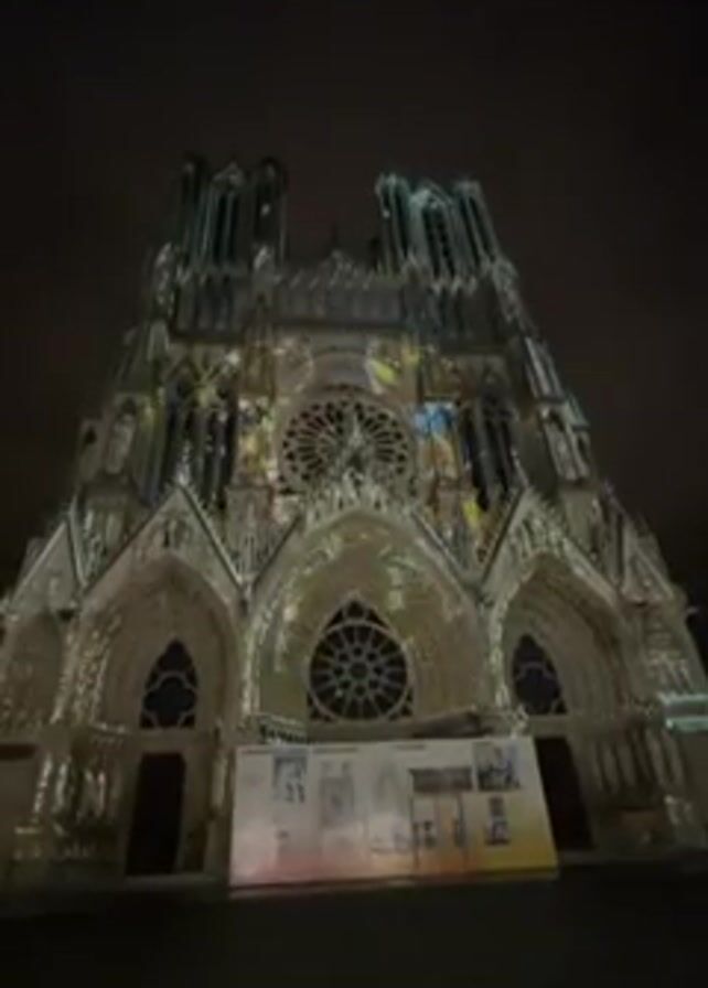 A wide angle shot depicts the front facade of a large, gothic cathedral at night, bathed in projected lights and colors that emphasize its architectural details