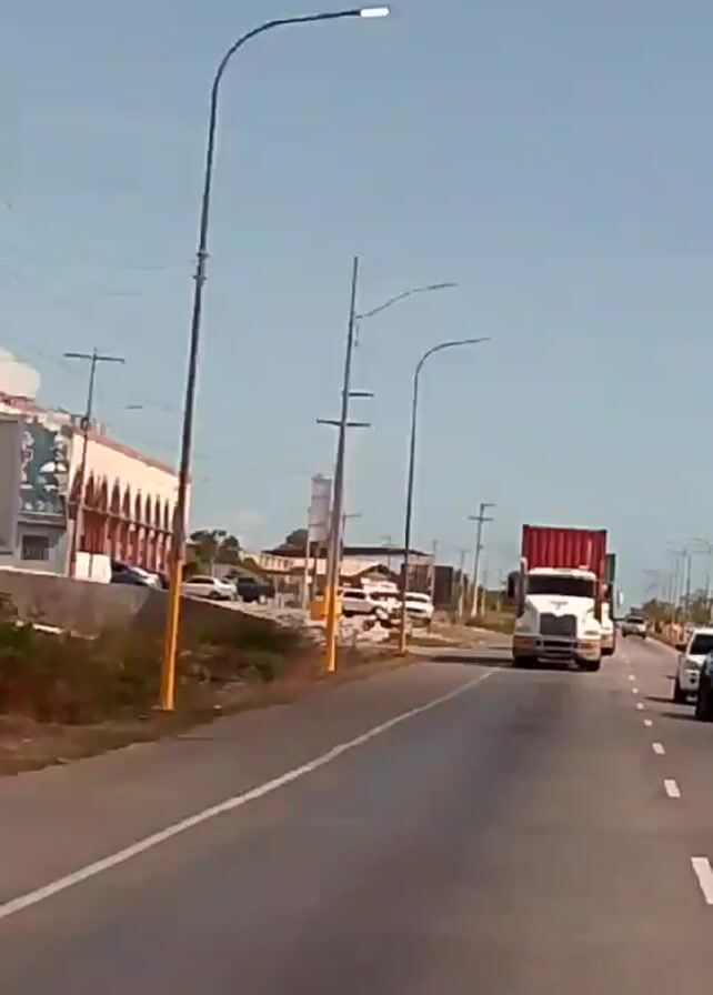 view from a vehicle moving on a highway. A large white semi-truck with a red trailer is in the lane ahead. To the right of the truck, in the adjacent lane, are a white car and a dark pickup truck. The road has white lane markers. Light poles line the side of the road. Buildings are visible on the left side of the road, and trees are on the right. The sky is clear and blue. The video is taken on an Infinix SMART 8.