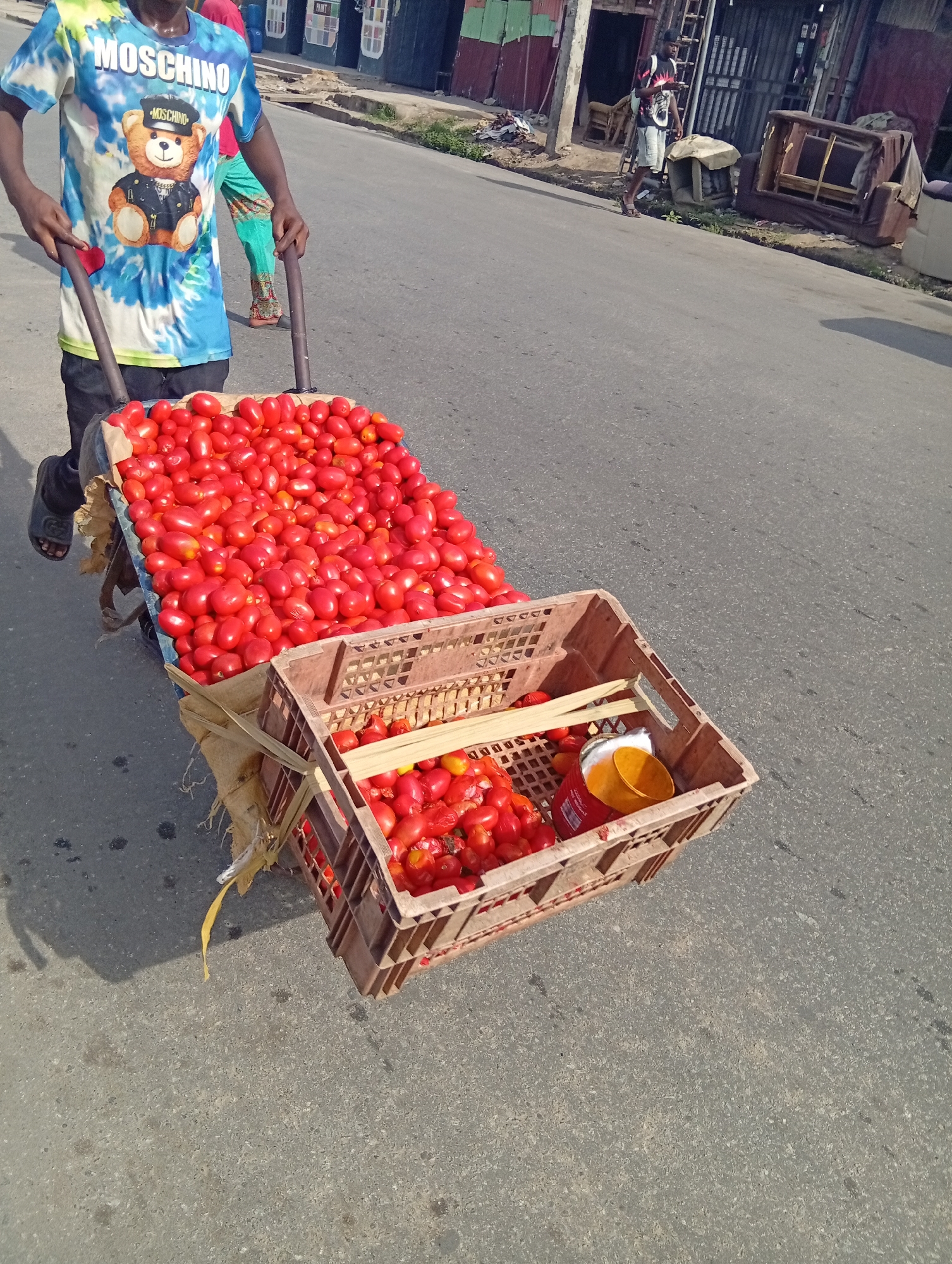 In Aba, Nigeria, a man wearing a blue tie-dye shirt with a bear image is pushing a wheelbarrow loaded with tomatoes down a paved street