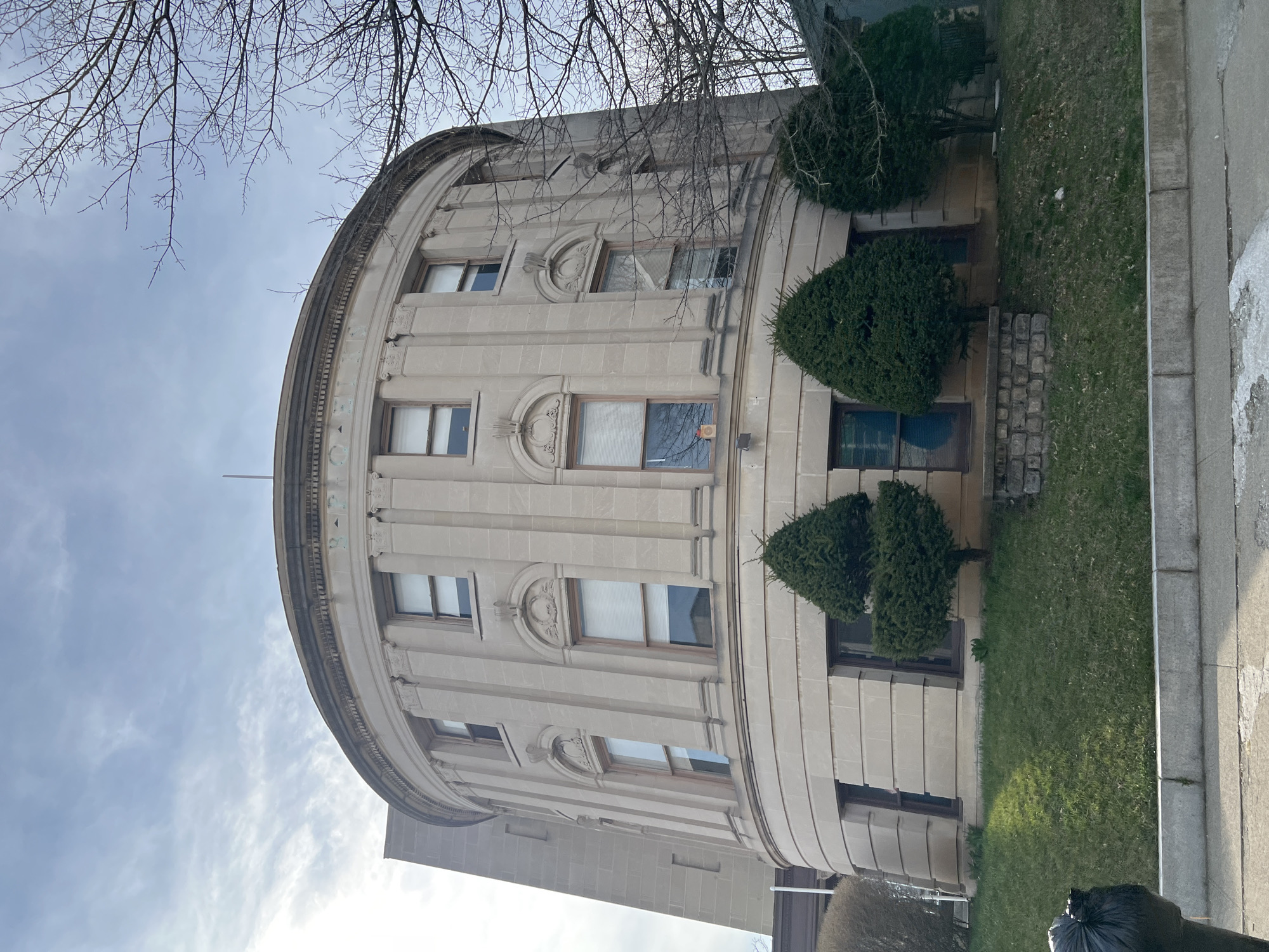The image depicts the former U.S. Post Office building in the City of Newburgh, New York. The building is a two-story, semi-circular structure with a light-colored stone facade. It features evenly-spaced fluted pilasters and arched window tops with decorative keystones. The windows are rectangular and have dark frames. Two cone-shaped evergreen bushes stand adjacent to the building. The foreground shows a grassy area and part of a sidewalk. A black trash bag is visible in the lower right corner. Bare tree branches are seen in the upper left corner against a cloudy sky.