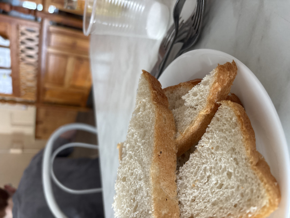 This image captures a static scene within an indoor dining environment, purportedly in Akul'shet, Russia. The foreground is dominated by a white ceramic plate containing four slices of light-colored, white bread, arranged in a casual stack. The bread slices exhibit a porous texture and have a lightly browned crust along the edges. The plate rests on a white table surface with a subtle grey marbling pattern. To the right of the plate, partially out of focus, are two metallic forks, one stacked over the other. Further right, a clear, ribbed plastic cup stands upright, containing an unidentified white granular substance, likely salt or sugar. In the blurred background, a person with reddish-brown hair, wearing a dark grey short-sleeved shirt, is seated with their back to the viewer. A white, metal-framed chair with a curved backrest partially obscures this individual. Beyond the person and chair, additional wooden furniture is visible, possibly carved screens or chair backs, indicating a communal dining or waiting area. The lighting appears to be ambient, originating from an unseen source. No active interactions or specific actions are discernible within the frame.