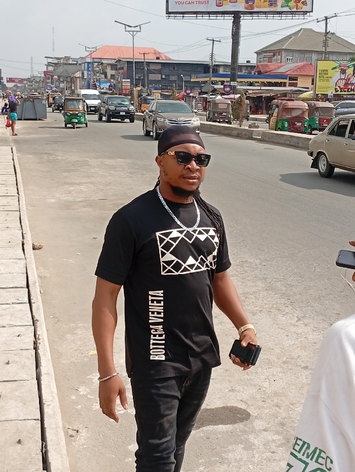 A man wearing a black t-shirt, black jeans, and a black head covering stands on a city street. He is also wearing sunglasses and a necklace. Behind him, there is road with cars, and buildings. A billboard is visible in the background. The man is looking directly at the camera. Another person is partially visible to his right.