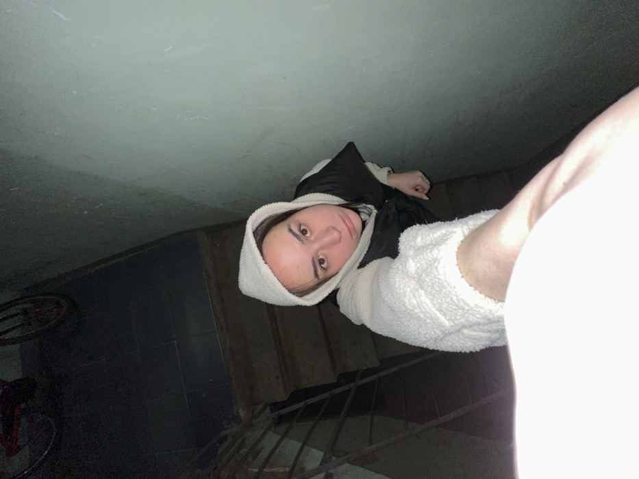 A young adult, appearing female, is depicted in a dimly lit indoor stairwell or hallway in Trudovaya, Russia. The individual, positioned slightly below the camera's perspective, extends their right arm towards the lens, indicative of a selfie. They wear a cream-colored, textured hooded fleece jacket over a dark puffer vest and dark trousers. Their expression is neutral, with direct eye contact towards the camera. The background reveals concrete stairs with a dark tiled surface and a metal handrail on the left. The walls are painted a faded light green. In the upper left quadrant, a portion of a red-framed bicycle is visible, seemingly mounted or leaning against a wall above the stair landing.
