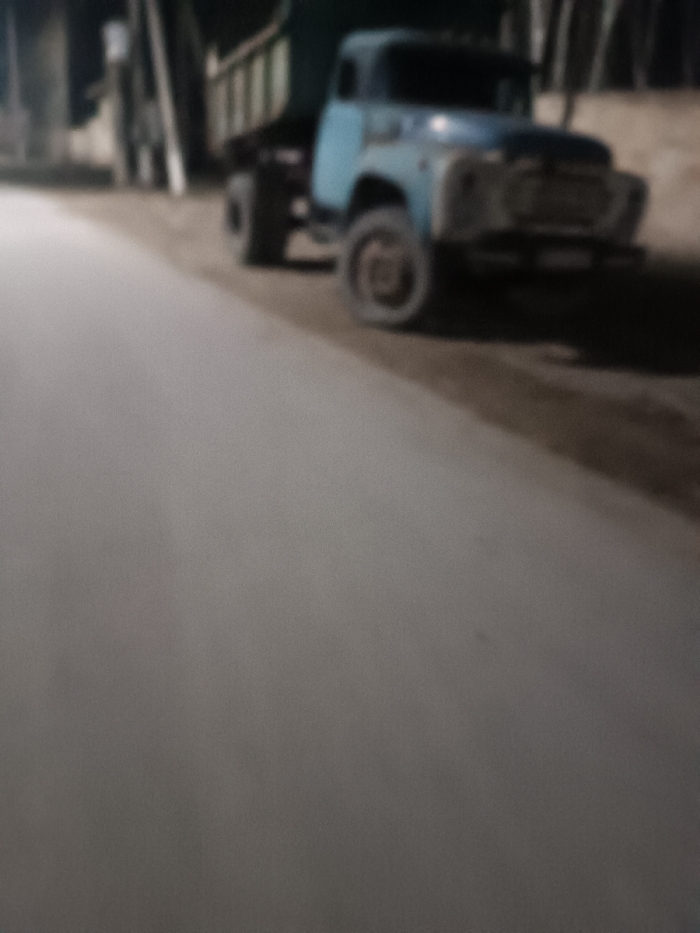 A blue truck is parked near a road. The truck, appearing old, has a green cargo bed. The foreground consists of an asphalt road, taking up most of the view. The background shows trees. The photograph's poor quality and low light cause details to be lost and make the image blurry.