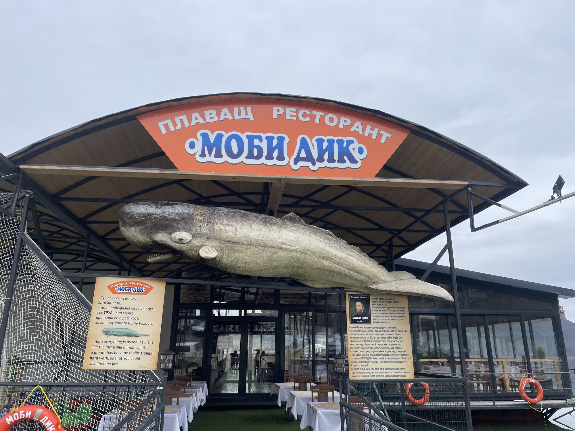 exterior of the "Moby Dick" floating restaurant in Brosh, Bulgaria. The restaurant's sign, in Bulgarian and English, is mounted above the entrance, adorned with a large model of a sperm whale extending from underneath. The structure of the restaurant appears to be constructed of metal and glass, providing a view into the interior dining area set with tables and chairs. In the foreground, there's a safety net and life preserver also with the "Moby Dick" logo. Other signs about Herman Melville, the author, and his novel are visible. The sky is overcast. There's a person working on the roof.