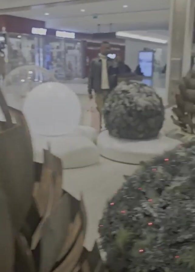 The video displays a mall's holiday decorations. The camera initially focuses on a sculpture comprised of interconnected, weathered-looking rectangles, which then transitions to a wider view featuring several decorative spheres and a snow globe displayed on white, irregular pedestals. The spheres include a traditional Christmas tree shape covered in fake snow, a decorative artichoke shape, and some spheres made of woven white material. A woman is briefly visible standing by the snow globe, but the focus remains on the decorations.