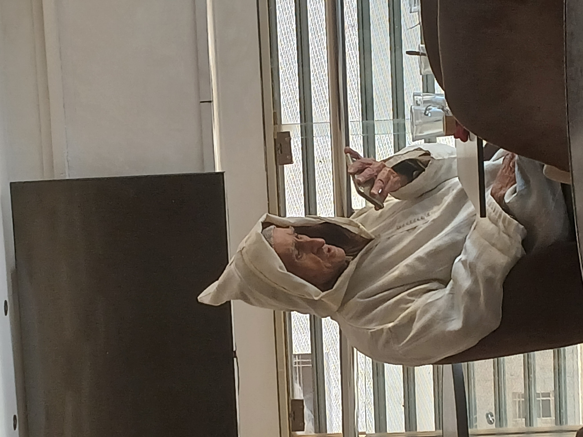 A statue depicting an elderly man in a white hooded robe is featured. The statue is positioned indoors, near a window with vertical bars and a view of an urban landscape of buildings. The statue appears to be part of an exhibit, potentially within a museum or similar cultural institution. The statue has realistic features, including wrinkled skin and a detailed representation of hands. The setting appears contemporary. Considering the detail of the statue, it's likely a display in an attraction related to the old city or historical exhibits in Meknes, Morocco.
