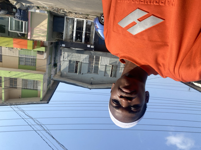 The image is a daytime selfie taken by a young male on an urban street in Lagos, Nigeria