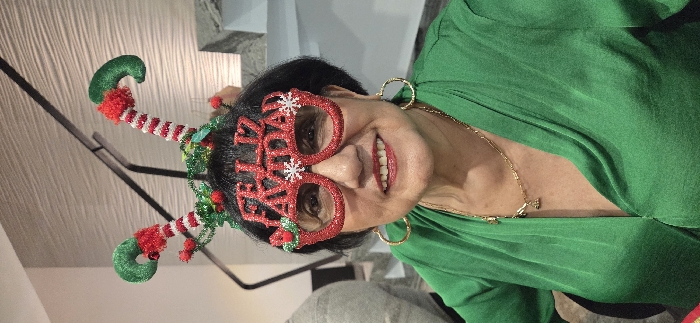 A woman in a green blouse smiles, wearing large hoop earrings and a gold necklace. On her head, she sports festive accessories: novelty "Happy New Year" glasses in red glitter and a headband with candy cane-striped antennae topped with green pom-poms. The background shows a modern interior with stairs and a light-colored wall.