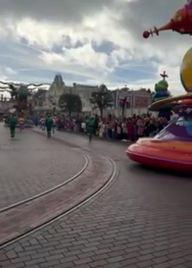 The video captures a parade at Disneyland Paris, featuring a "Toy Story" themed float