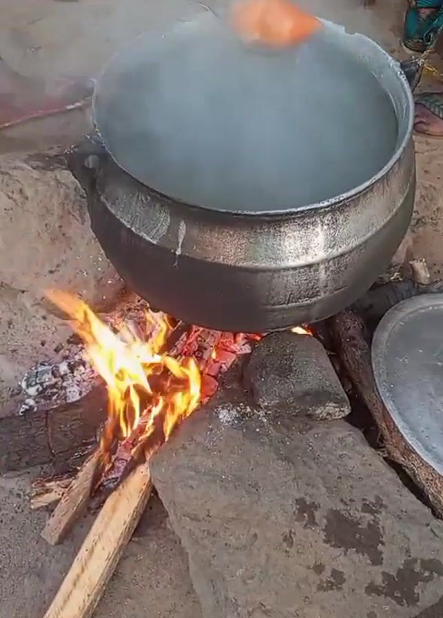 A large metal pot is placed over a wood fire outdoors, supported by two large rocks