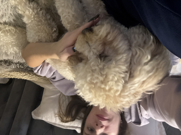 A person lies on their back with a fluffy, cream-colored dog nestled against their chest. The person wears a light purple hoodie and has brown hair. The background includes a pillow, blanket, and dark blue fabric. The dog's fur obscures much of the person's upper body. The photo is taken at an angle, with the subject's face near the bottom of the frame.