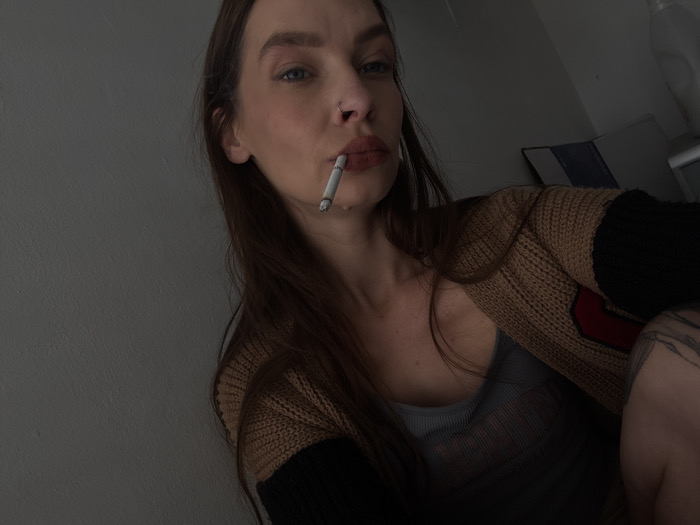 The image presents an adult female indoors in Bat Yam, Israel. The subject, possessing long brown hair, blue eyes, and fair skin, directly faces the camera. A small silver stud pierces her right nostril. She holds a lit cigarette, displaying a filter and ash, between her lips. Her attire consists of a light grey ribbed tank top worn beneath a brown knitted cardigan, which features black sleeves and a red patch on the wearer's left side. A tattoo with dark linear patterns is partially visible on her left upper arm. The background is a plain light grey wall on the left. The upper right background shows indistinct objects, including a white surface and a blue and white striped item. The scene is dimly lit, with illumination emphasizing the subject's face.