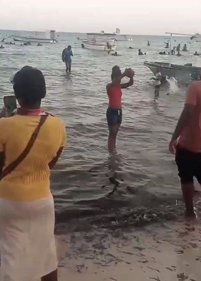 A woman in a yellow top and white skirt stands on a sandy beach, holding a smartphone and filming. She is facing a young girl in a pink top and dark shorts, who is standing in shallow water, holding a coconut over her head with both hands. A man in a salmon-colored shirt and black shorts stands to the right of the girl. The water is filled with other people and several boats are visible in the background. The overall tone of the scene is casual and relaxed.