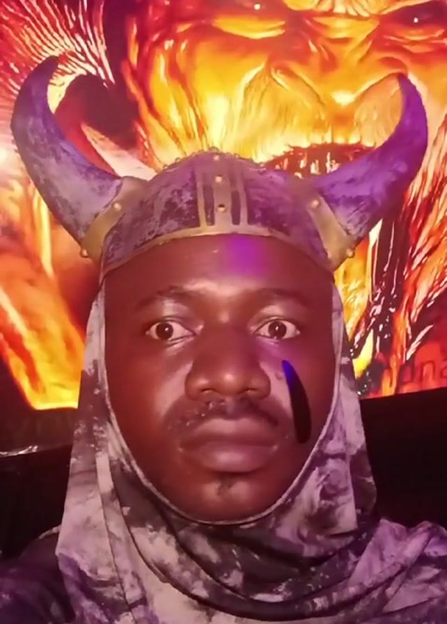 A man wearing a Viking helmet and head covering stands facing the camera. He has a black streak of paint or makeup on his left cheek. Behind him is a poster with an image of a monster or animal face in shades of orange and yellow. A low growling sound is heard as he looks to the right and then back to the camera.