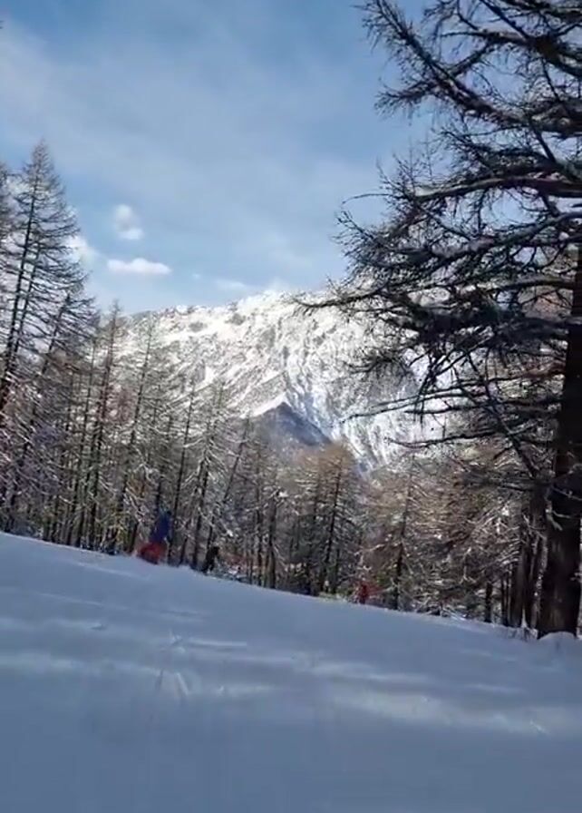 first-person perspective of someone snowboarding down a snowy slope. Several other skiers and snowboarders are visible on the slope, and the scenery includes snow-covered trees and a large, snow-capped mountain in the background under a partly cloudy sky. The snowboarder's board is visible at times and has the word "Sila" written on it.