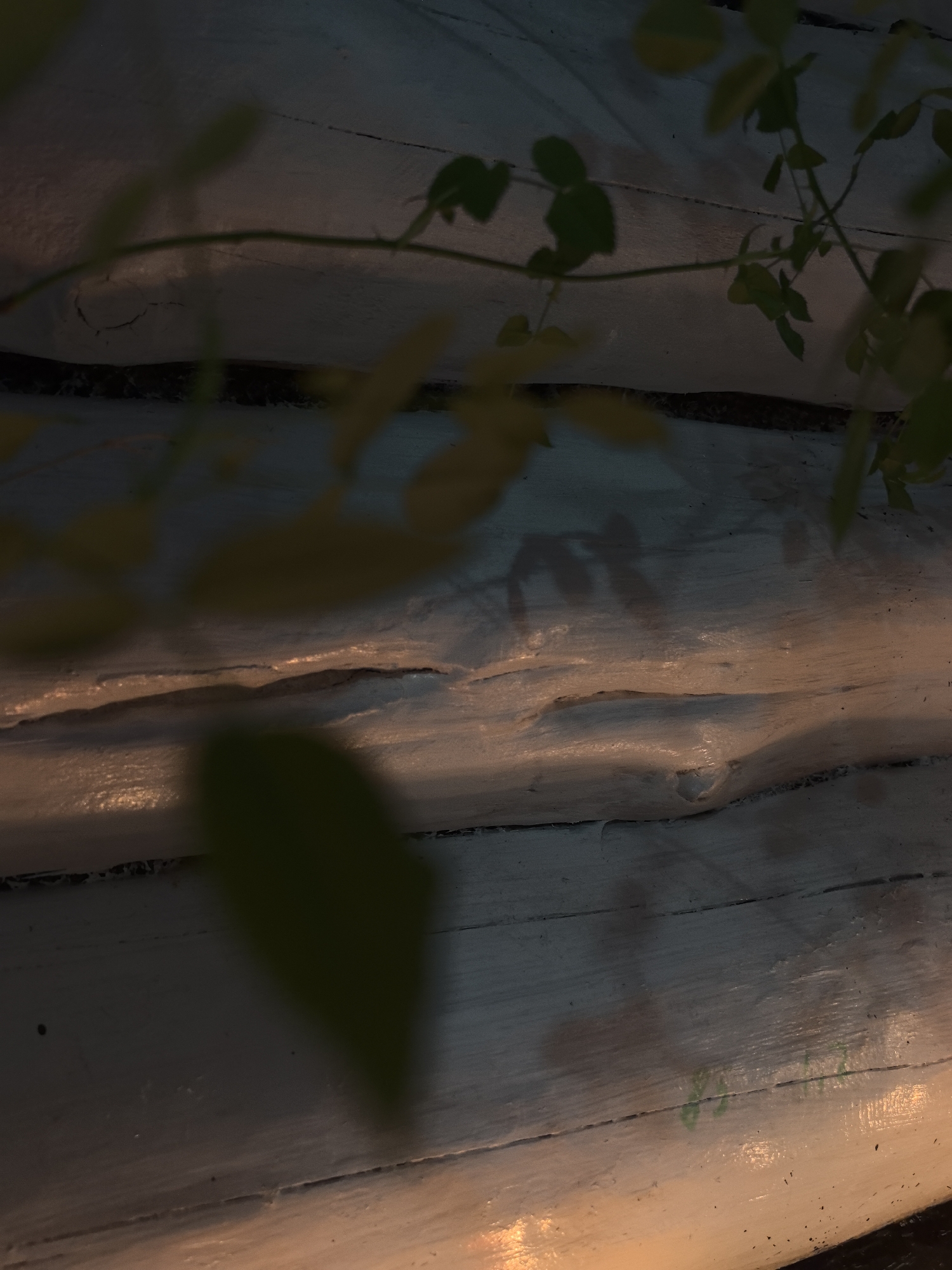 The image presents a close-up view of a roughly textured, whitewashed wooden surface, possibly a wall or structure. In the foreground and partially obscuring the view, there are green leaves and stems of a climbing plant. The wood appears aged and uneven, with deep crevices between the planks, suggesting a weathered and rustic aesthetic. The lower portion of the image has a warm, golden light source reflecting off the wood, contrasting with the overall cool tone. The location is not specified, and there is no reference to the city of Noviy, Russia. There are no people, actions, or interactions visible in the image.
