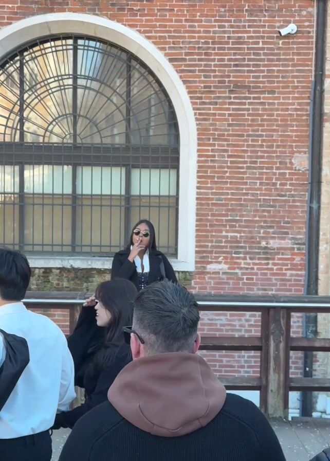 A woman in a black blazer, white shirt, black corset, and black pants is smoking a cigarette and looking at the camera. She is also wearing sunglasses and carrying a black purse. She is standing on a bridge in front of a brick building with a large arched window. Other people are standing around her.