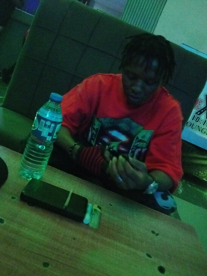 A person with dreadlocks sits at a table in a dimly lit room with green lighting. The person wears a red shirt with a graphic design. A water bottle and a small wooden tray holding a cigarette and a lighter are on the table. The person's hands are close together as if in thought or performing a task. A couch and possibly a bar menu are in the background.