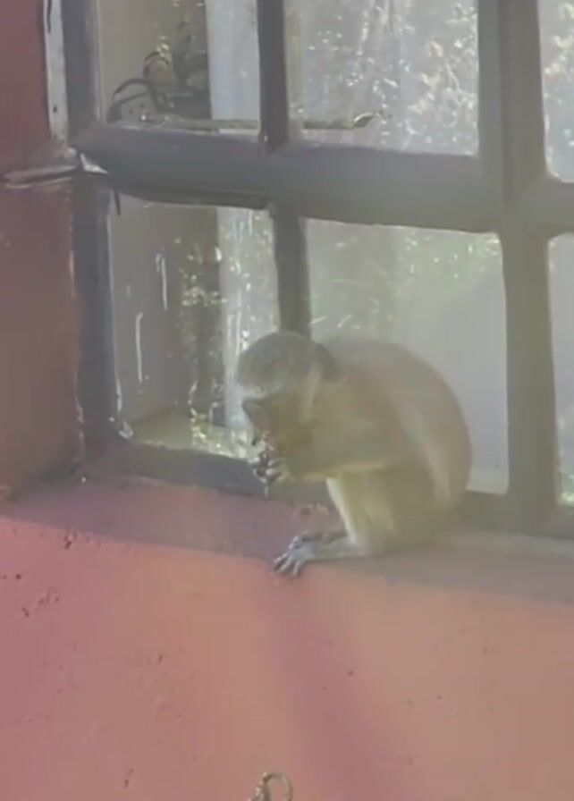 vervet monkey sitting on a windowsill outside a building
