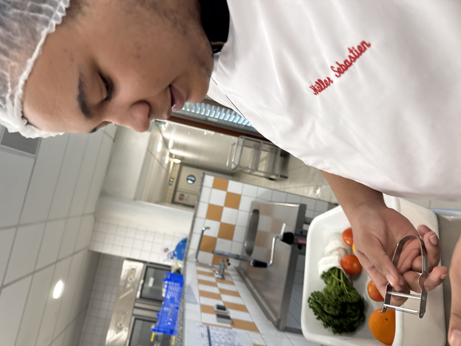 professional kitchen environment in Schiltigheim, France. A male individual, visible in profile from the chest up, is positioned on the right side of the frame. He wears a white chef's jacket with "Müller Sébastien" embroidered in red script on the left chest, and a white disposable hairnet. His right hand holds a metallic vegetable peeler over a white plastic tub. The tub contains fresh produce, including green broccoli florets, white garlic bulbs or onions, red tomatoes, and an orange. The background features a stainless steel counter equipped with an integrated sink and a faucet. The wall behind the counter is tiled with a distinctive white and orange checkerboard pattern, transitioning to plain white tiles above. To the left, large stainless steel commercial refrigerators or ovens are visible, along with a blue plastic crate on the counter. Further in the background, a three-tiered stainless steel utility cart stands near a corridor. The corridor extends towards a closed white door marked with a blue circular emblem and a dark push bar. Overhead, fluorescent lights illuminate the white ceiling.