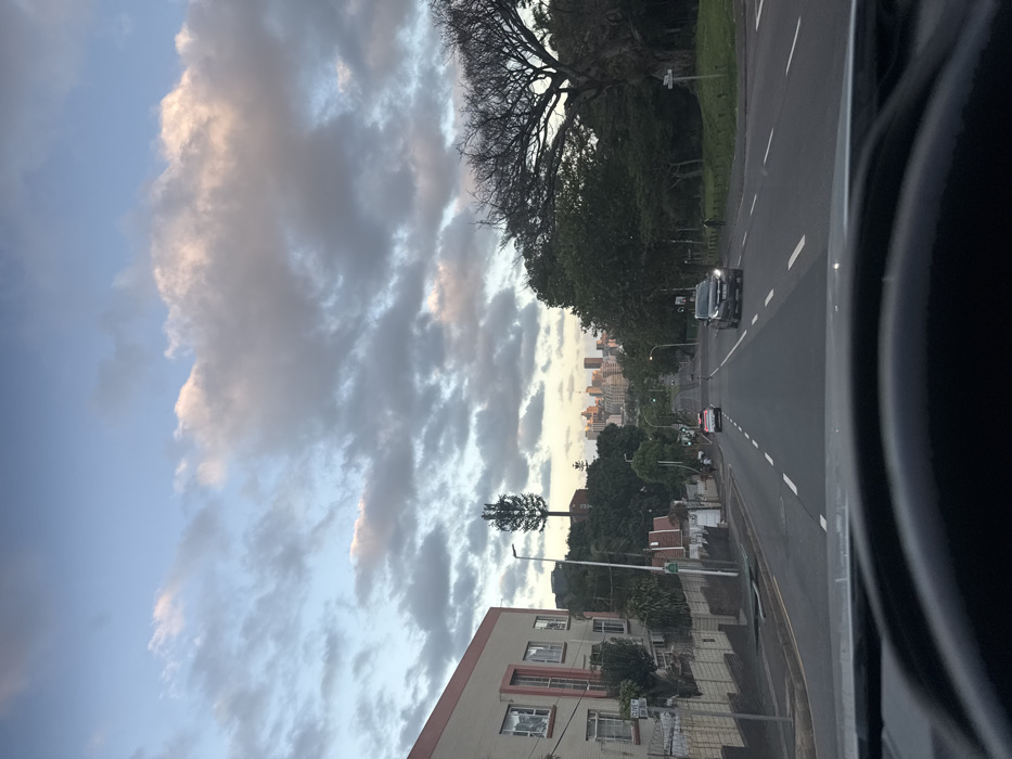 The image presents a street-level view from inside a vehicle, looking down a road towards the city center of Durban, South Africa, during early morning or late afternoon. The top of a steering wheel is visible at the bottom of the frame. The sky occupies the upper two-fifths, featuring a mix of pale blue and stratocumulus clouds, with some clouds exhibiting faint pink and orange hues. The two-lane asphalt road descends gradually into the distance, marked by broken white lane dividers and a double solid white line further ahead. On the left side of the road, a multi-story residential building with beige walls and red trim is prominent, fronted by a concrete wall topped with barbed wire. A green street sign identifying "CLIVE ROAD" is partially visible. Further along the left, a tall cellular tower, camouflaged as a pine tree (monopine), rises above the treeline. On the right side of the road, a large deciduous tree with a wide, bare canopy stands over a grassy verge. Two vehicles are visible on the road, traveling away from the viewer: a white sedan in the left lane and a dark-colored pickup truck with illuminated headlights in the right lane. An indistinct dark figure is present on the right sidewalk, adjacent to the pickup truck. The distant background reveals the skyline of Durban's central business district, characterized by multiple high-rise buildings, some reflecting the soft ambient light.
