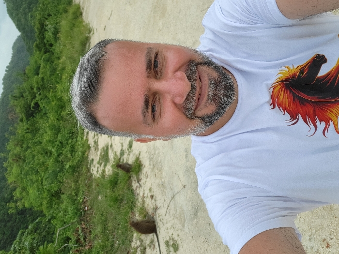 A man takes a selfie outdoors. He wears a white t-shirt with a horse design. He has graying hair and a beard. The background features lush green vegetation and a dirt path. Two monkeys are visible on the ground near the greenery. The sky is overcast. The photo is slightly rotated.