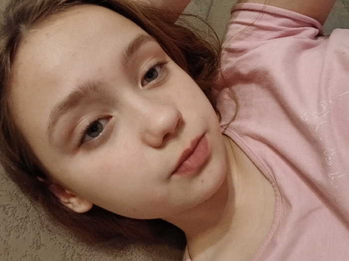 A young person with fair skin and light brown hair is angled upward, gazing at the camera. The individual has light eyes and a somewhat neutral expression. They wear a light pink t-shirt. The background appears to be a tan or brown textured surface, likely a sofa or bed. The lighting is soft and diffused, casting gentle shadows on the face.