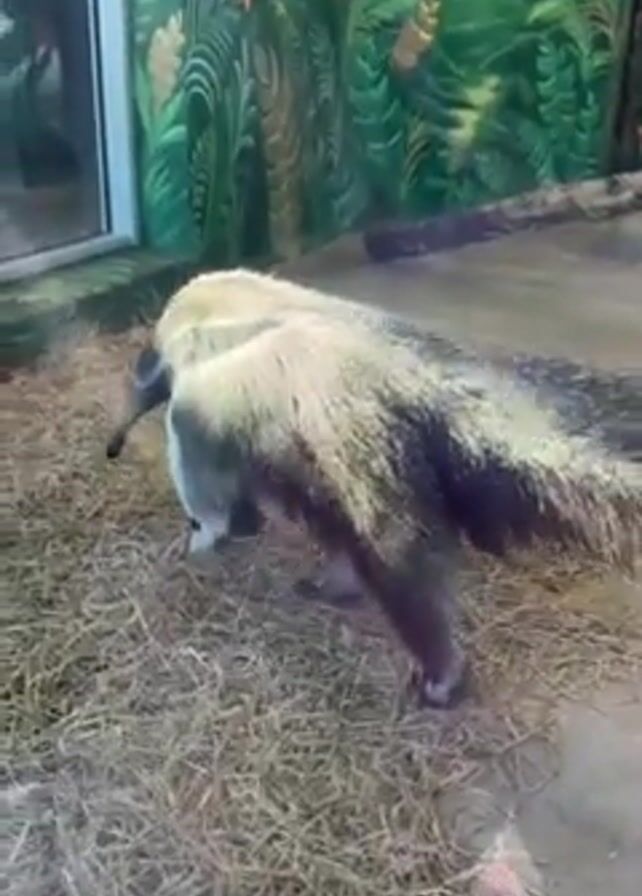 giant anteater in its enclosure at a zoo or animal park. The anteater is walking on a ground covered with straw, with a painted backdrop of a tropical jungle behind it. The enclosure is visible through a glass barrier. The anteater walks away from the glass, showing its long tail and distinctive markings. The sound of a child's voice can be heard in the background.