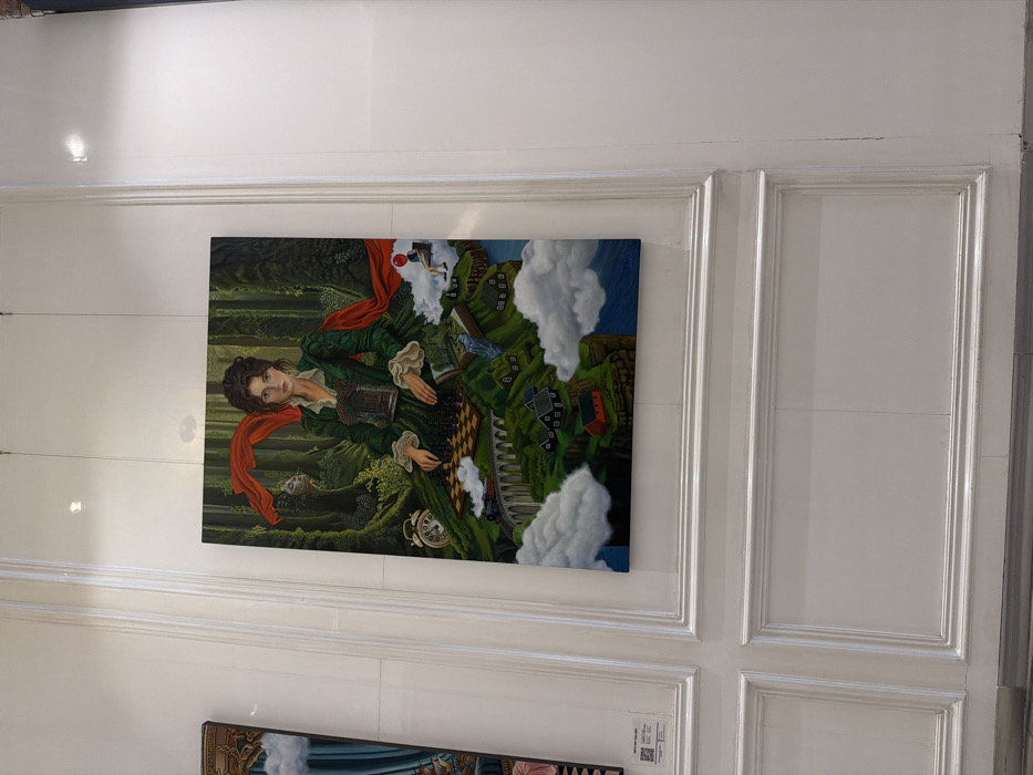 A vertically oriented oil painting depicting a surrealistic scene is displayed on a white, paneled wall within an art gallery in Mexico City, Mexico