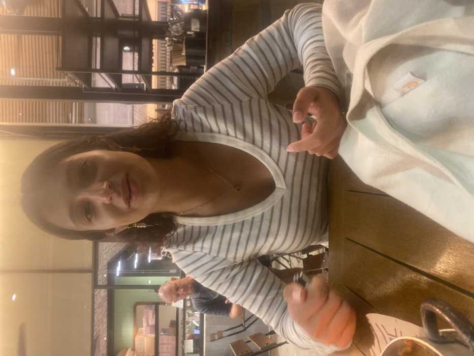 An indoor scene, identified as a commercial establishment consistent with a restaurant or cafe, is depicted in Ness Ziona, Israel. In the foreground, a young adult female with dark, wavy, shoulder-length hair and a medium complexion is seated at a wooden slatted table, facing the viewer. She wears a long-sleeved, light-colored shirt with horizontal grey stripes and a V-neck, a delicate gold-toned necklace with a dark pendant, and small, dangling earrings. Her mouth is slightly open. Her left hand, visible on the table, holds a small dark object, and her palm and fingers exhibit orange residue. Her right hand rests on the table. In the mid-background, to the left, a bald adult male in a dark t-shirt is seated at another table, looking downwards and to his right, not engaging with the foreground subject. The background includes display cases with items in pink boxes, dark shelving units containing utensils, and additional chairs. The lighting is artificial and warm.