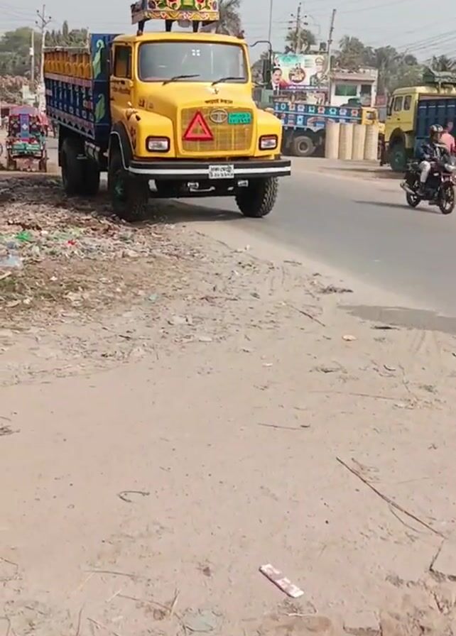 yellow truck parked on the side of a paved road. The truck has a blue, green, and red decorated roof and a triangular sign on the front. To the left of the truck is a dirty shoulder with trash. A man wearing a suit walks across the road in front of the truck. There is a scooter and other trucks further down the road. The scene appears to be in a rural or semi-urban environment.