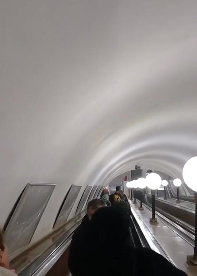 A slightly shaky, low-angle shot shows people riding up a long escalator in a subway station