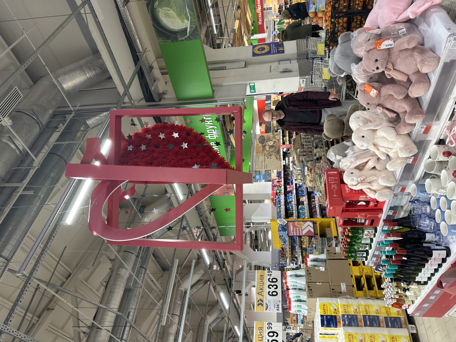 The image captures an aisle in a supermarket, tilted upwards to reveal the ceiling structure of metal beams and pipes. Hanging decorations include a red, star-studded semicircle within a pink frame, along with green banners promoting fruit. Shelves are packed with goods, including plush toys, mugs, wine bottles, toilet paper, and other household items. A shopper wearing a dark jacket is visible among the merchandise. Price tags and promotional signs advertising sales are present.