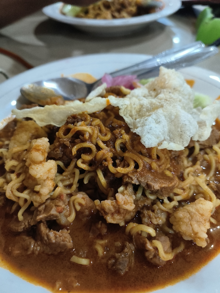 - "A white ceramic plate, positioned prominently in the foreground, holds a substantial serving of an Indonesian noodle dish, specifically *Mie Aceh* or a similar regional variant, located in Lhokseumawe, Indonesia" by FM-GjfbY2, licensed under CC BY 4.0